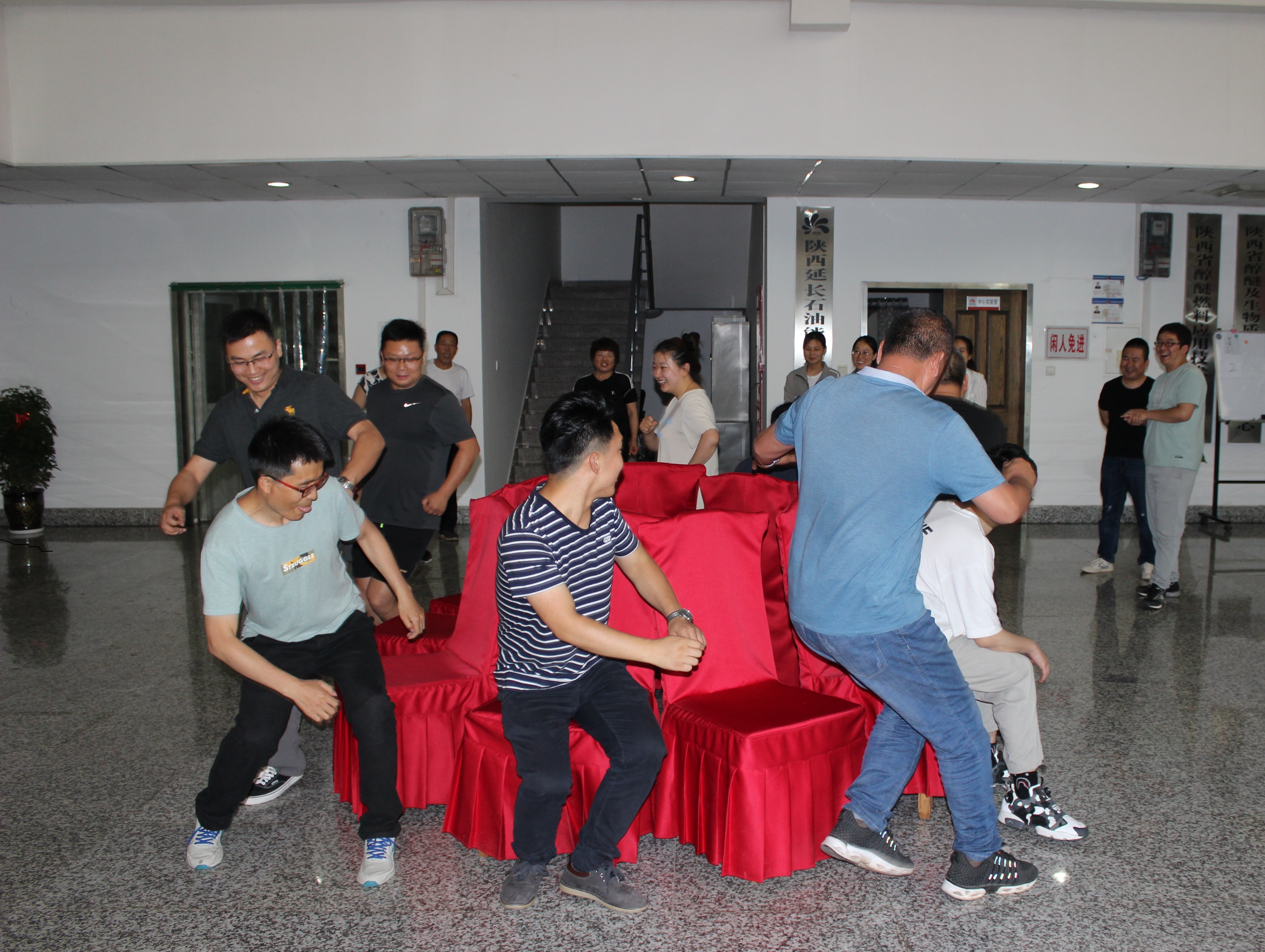 本次活动以“挥洒阳光,凝聚合力,共逐梦想”为主题。活动开始,组织进行了抢凳子、踩气球两项集体热身游戏活动。全体人员分组参与了活动,在明快、激昂的乐曲声中,各组人员热情高涨积极投入,活动气氛异常活跃,起到了热身效果。